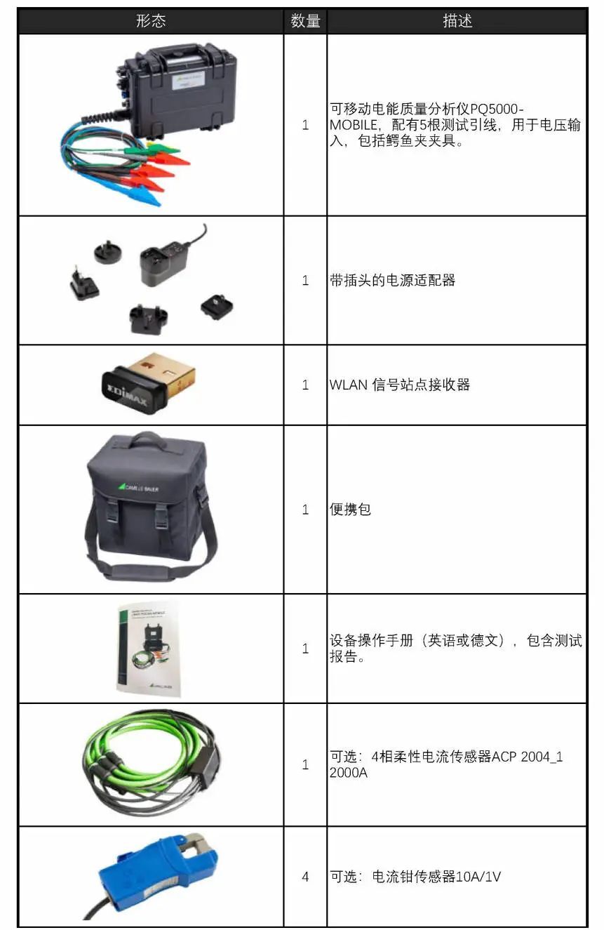 PQ5000-mobile定位為便攜可移動電能質(zhì)量監(jiān)測裝置,有別于傳統(tǒng)的固定安裝式的在線監(jiān)測版本,PQ5000-mobile隨貨包含或可選以下配件。
