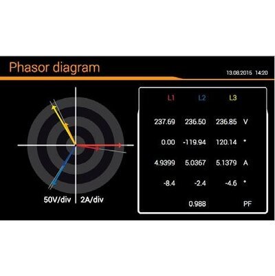 時間校準(zhǔn)顯示電壓和電流矢量以及功率因素的所有階段,因而錯誤階段的序列, 旋轉(zhuǎn)或者反向電流的錯誤感知能夠被安全的認(rèn)出。